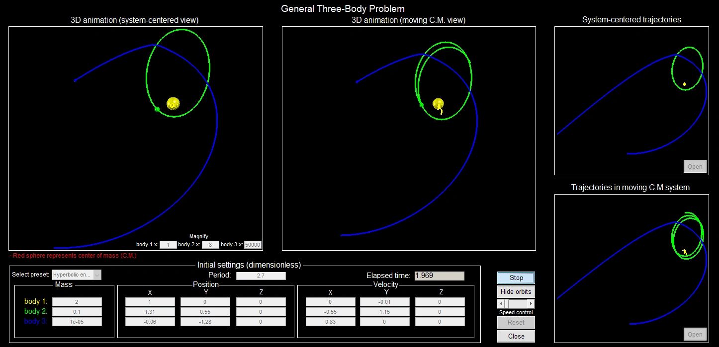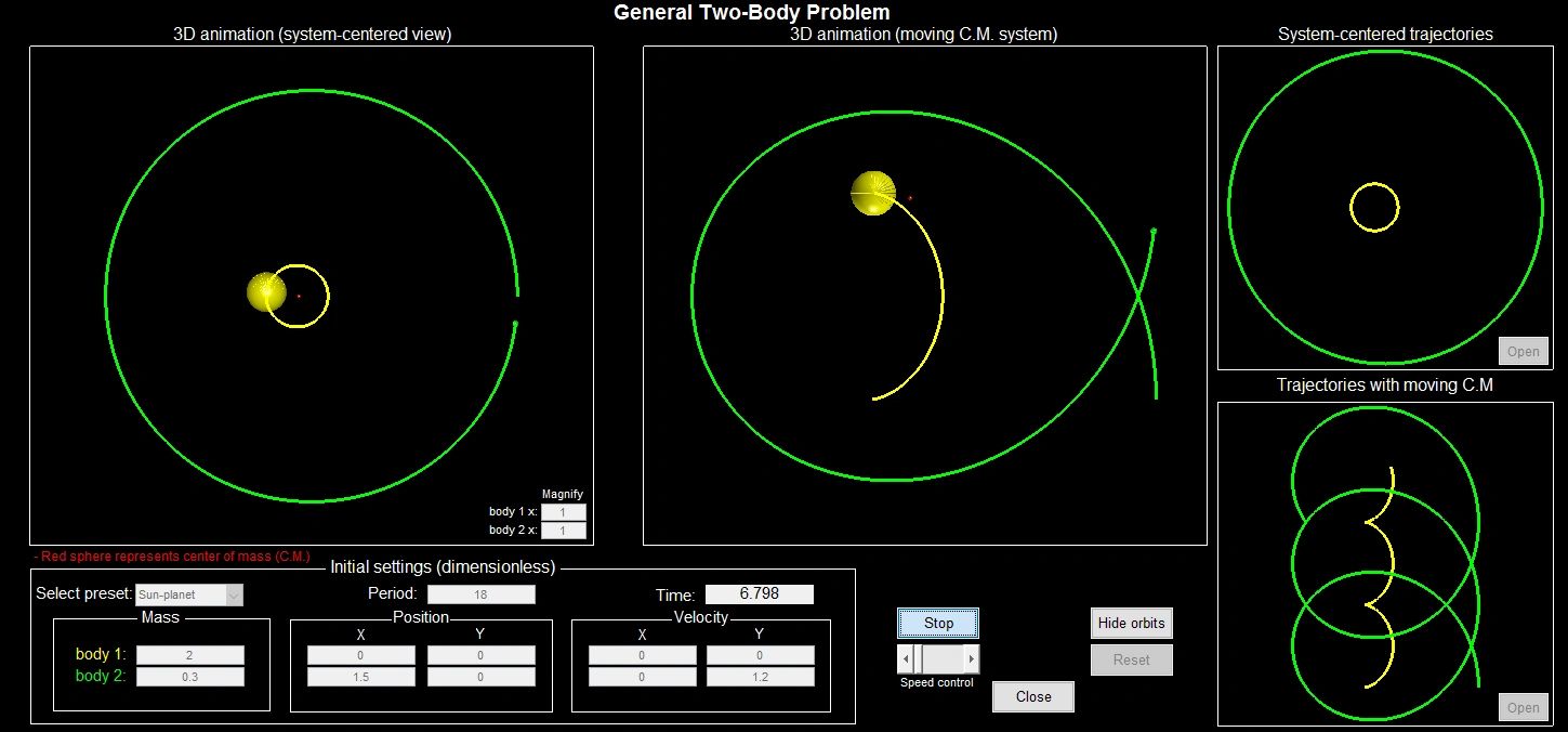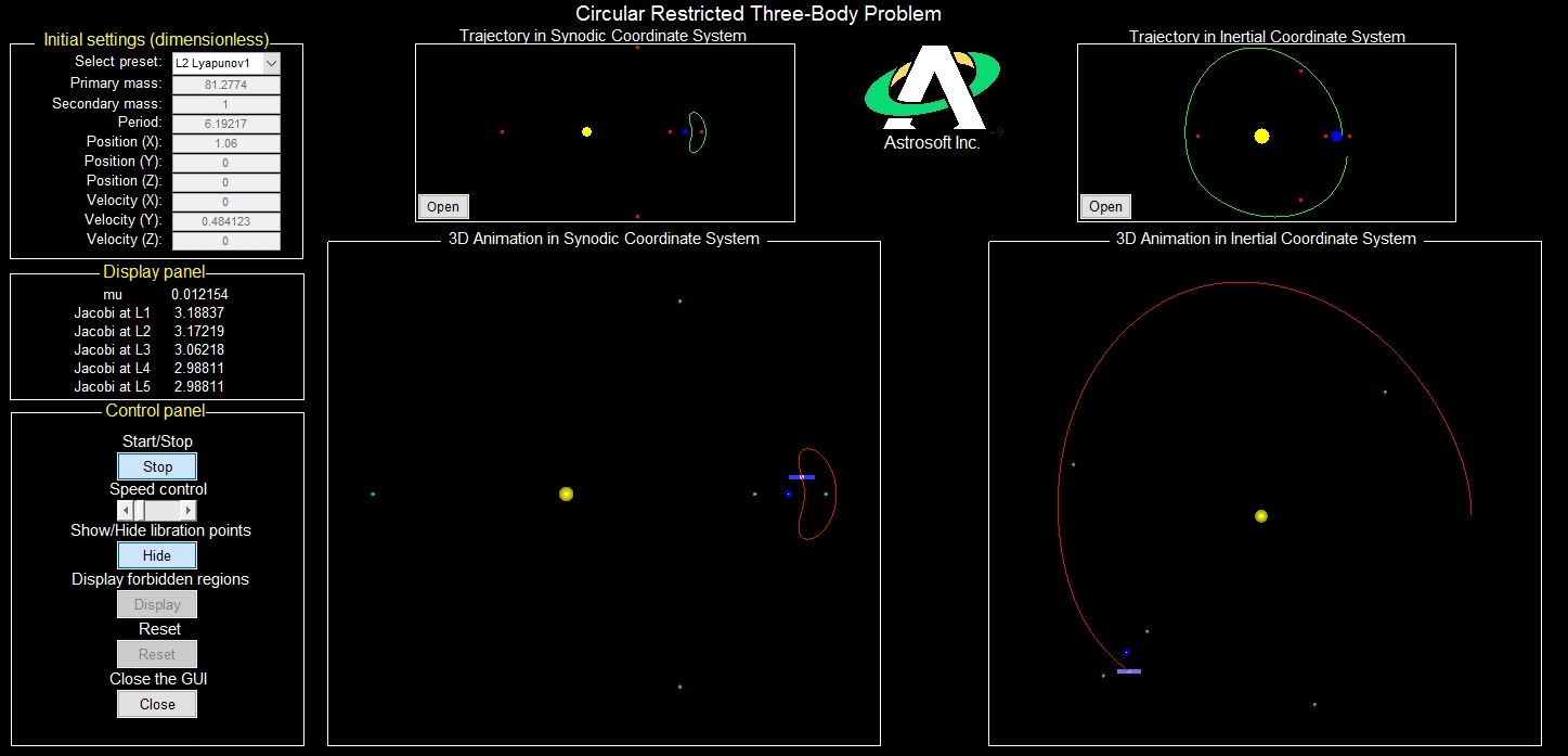 CRTBP is a special case of the three-body problem in which simplifying assumptions are made. A well-known example is the motion of a planet with a satellite around a star (e.g. sun-earth-satellite). The second body has a circular orbit and the third body is massless. There are many preset options that can be simulated.