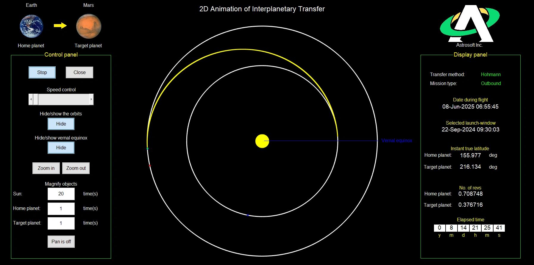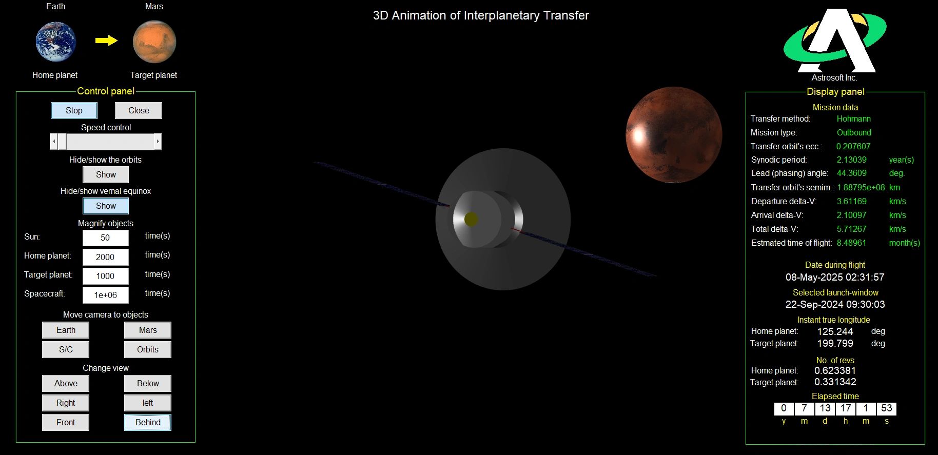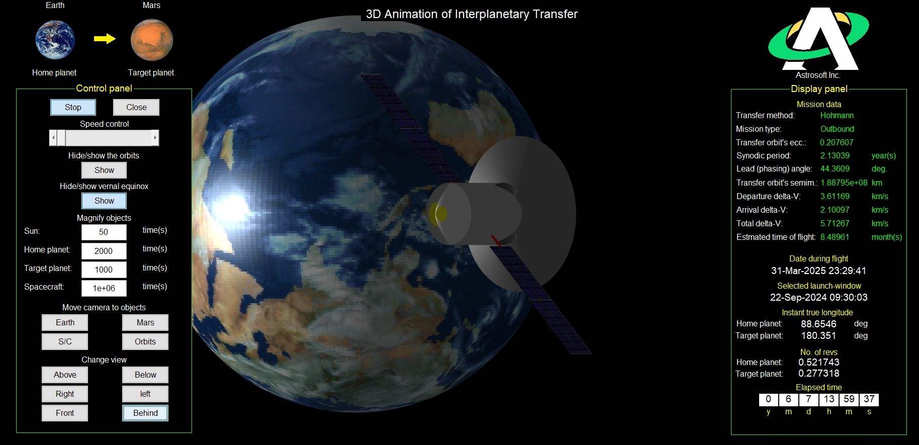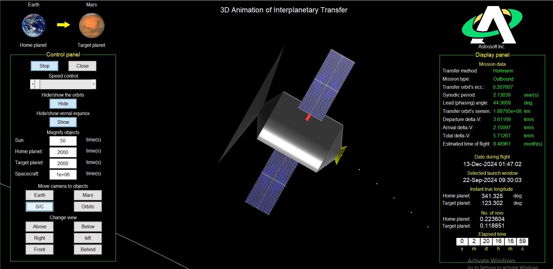 A 3D animation of flight can be run with instant data shown on display panel. You can choose to show or hide the orbits and vernal equinox direction. In addition, you can change the view perspective and and also move the camera to your object of interest as seen in the following screenshots.