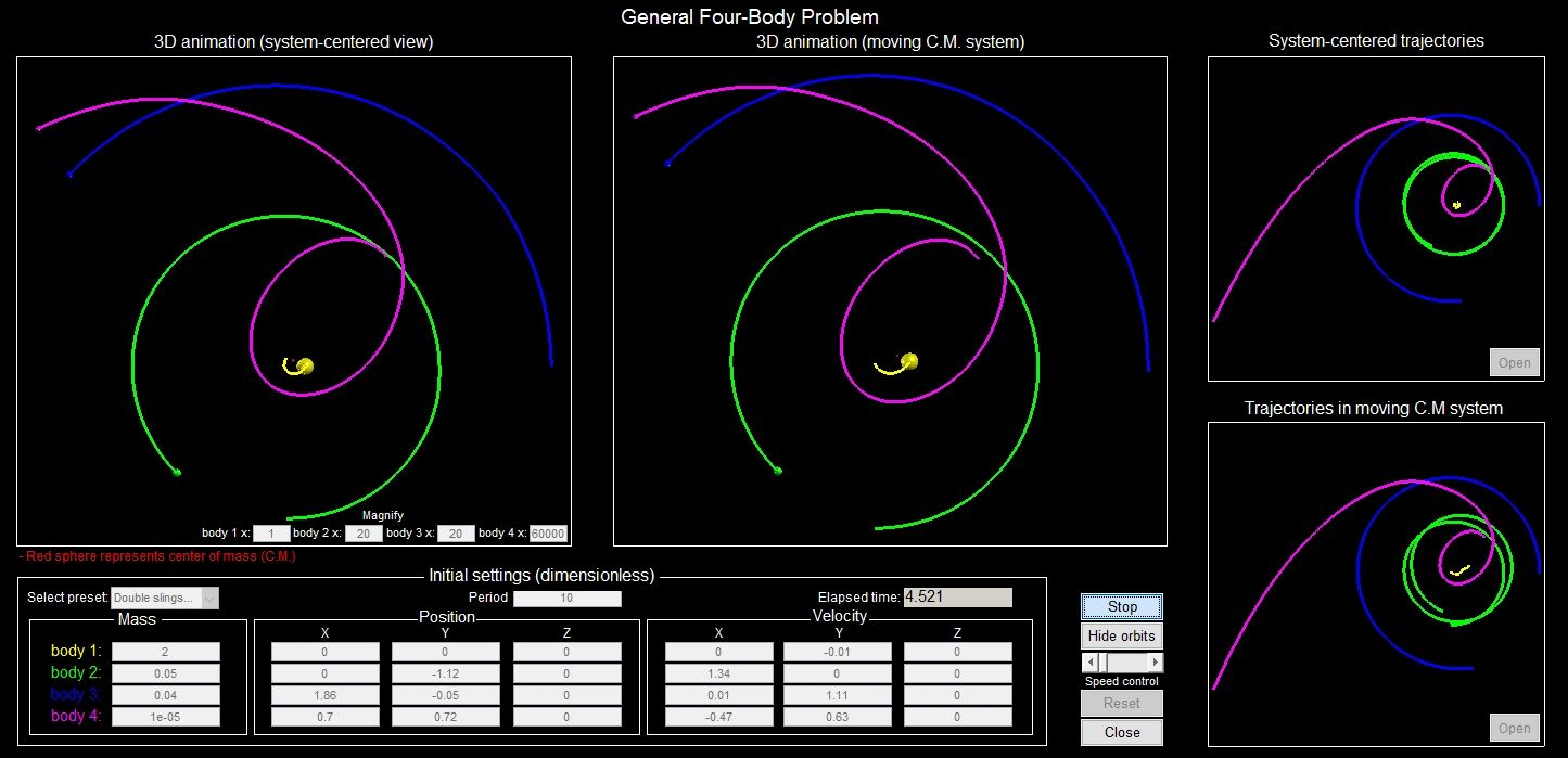In the Four-body system, the gravitational pull from each body affects the other three and all of them start to rotate around barycenter. The fourth body gets a boost during the encounter with the second and third bodies and leaves the system in a hyperbolic trajectory.