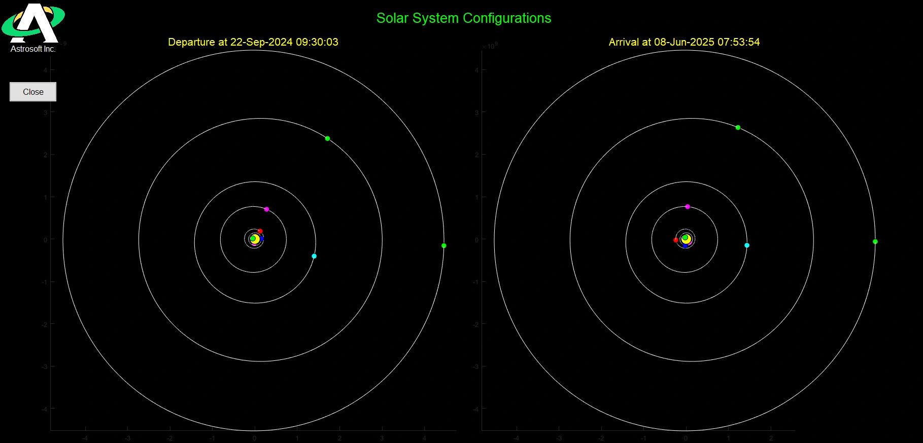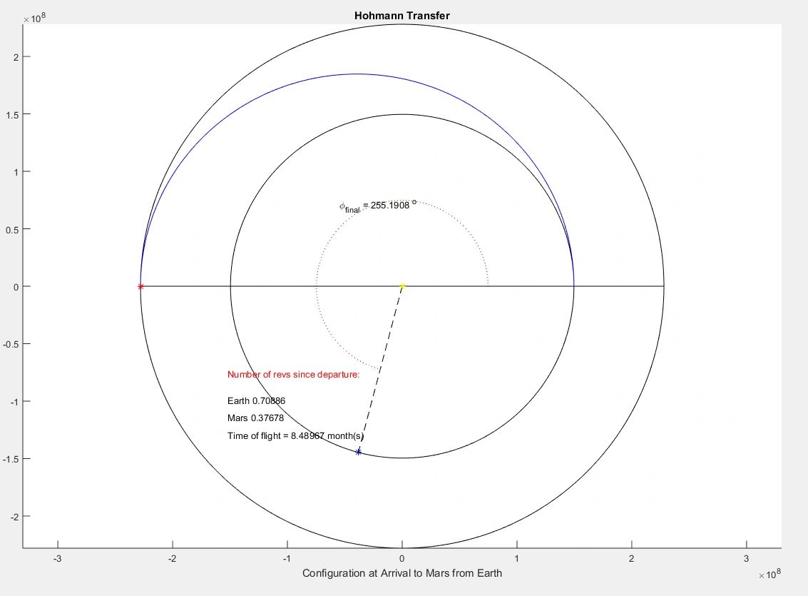 Simulate the trajectory and planetary configuration at arrival to target planet.