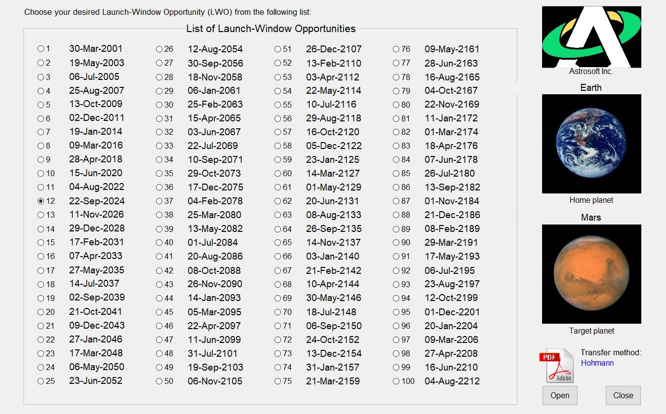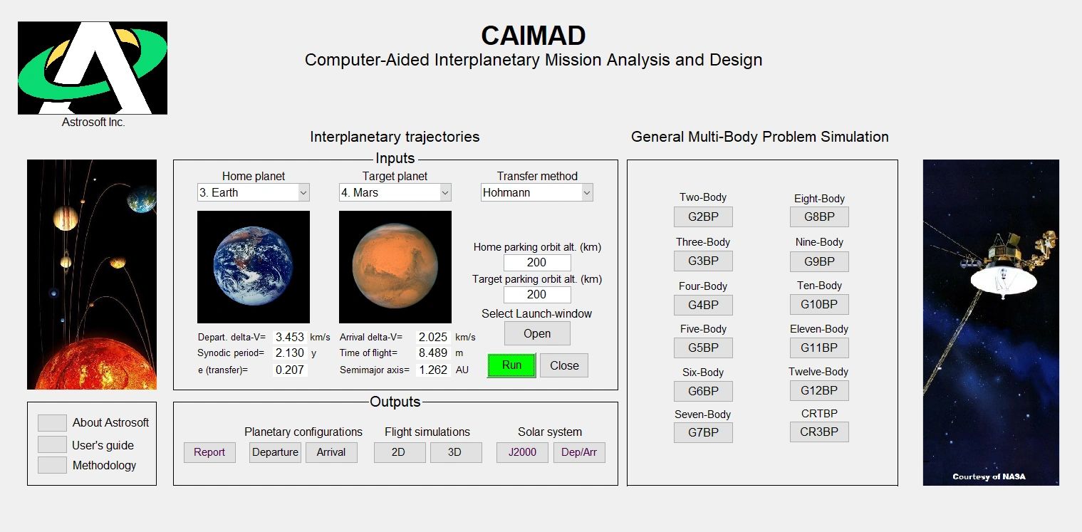 CAIMAD simulates interplanetary trajectories from any planet to any planet using the Hohmann and one-tangent burn transfer methods.